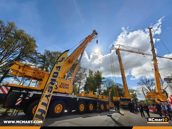 - Sarens and Forsyth cranes, dominating the horizon with towering booms.